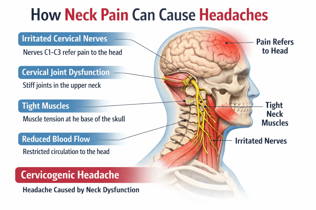 Headaches that start in the neck — known as cervicogenic headaches — are recognized as a real and treatable condition when neck dysfunction is present. Because the pain is referred from the neck, taking medication alone may not provide lasting relief unless the underlying neck issue is addressed.